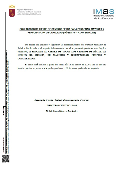 Inicio / Actualidad /Comunicado de cierre de centros de día para personas mayores y personas con discapacidad, IMAS