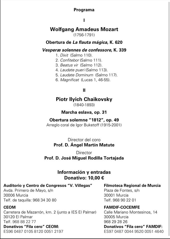 12 de febrero de 2018 – 20 horas. Auditorio y Centro de Congresos “Victor Villegas” de Murcia con la Orquesta Sinfónica y Coro del Conservatorio Superior de Música “Manuel Massotti Littel”.